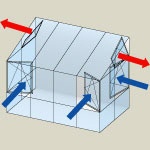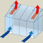 Über die Zuluftöffnungen strömt die Frischluft ins Rauminnere und nimmt warme und feuchte Luft auf. Durch die natürliche Thermik steigt die Luft nach oben und wird hier von der Fortluftströmung nach außen geleitet